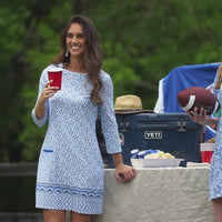 The Blue Emblem Cabana Shift Dress features a classic print perfect for year-round wear. Our best-selling silhouette, this classic boat neck dress has 3/4 sleeves & a lightweight UPF 50+ to keep you protected every day to vacay. This versatile style can be worn to cheer on your team or cover up at the beach.