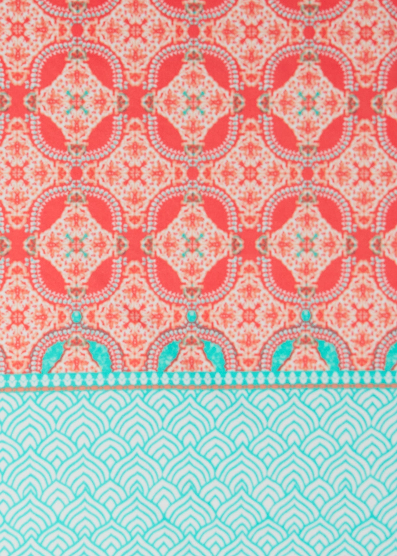 - Color scheme mainly coral pattern with minty border and pocket