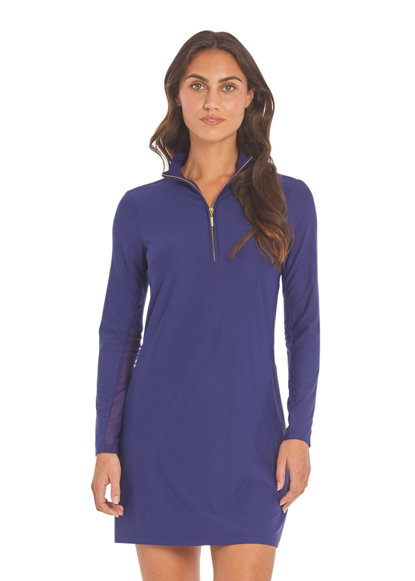 The Navy 1/4 Zip Sport Dress will be your new favorite for pickleball evenings with your besties. Featuring a gold quarter zip, long sleeves with mesh detailing to keep you cool, pockets and UPF 50+ performance fabric, you’ll be on your best game in this athletic dress.